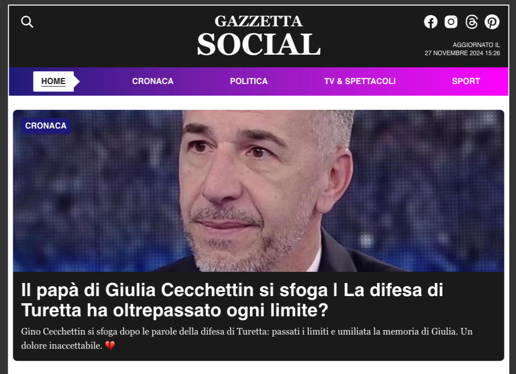 Dedicato a intercettare e analizzare i fenomeni sociali del momento, il sito web Gazzetta.social offre una vasta gamma di contenuti utili e coinvolgenti, coprendo tutto ciò che è di tendenza e rilevante.Le notizie ottengono visibilità tramite la relativa pagina Facebook di oltre 150.000 followers.